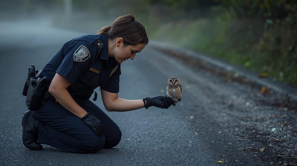 Early one morning, Officer Sarah received an unusual report: a tiny owl was sitting directly in the middle of a road, refusing to move. When she arrived, several cars had already slowed down, unsure how to pass the small bird without harming it. The baby owl sat stubbornly on the asphalt, calmly watching the world around it as if the busy road belonged to it.