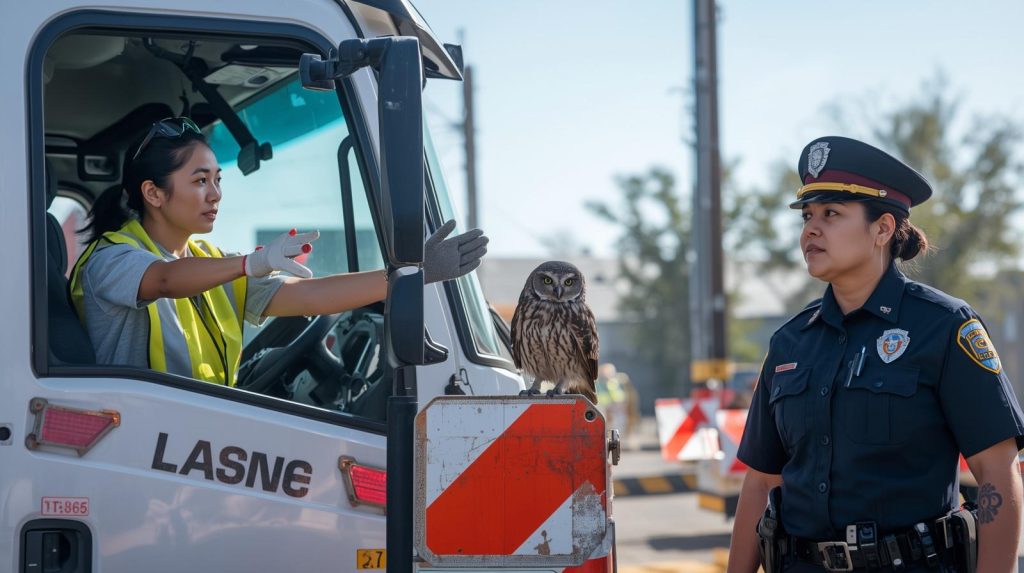 Meanwhile, traffic began building up behind Sarah’s patrol car. Despite its tiny size, the owl had effectively stopped vehicles in both directions. A local truck driver named Ray stepped forward to help manage the situation, guiding cars through a nearby alley to keep the road clear. With the traffic problem under control, Sarah could finally focus on the real mystery surrounding the bird.