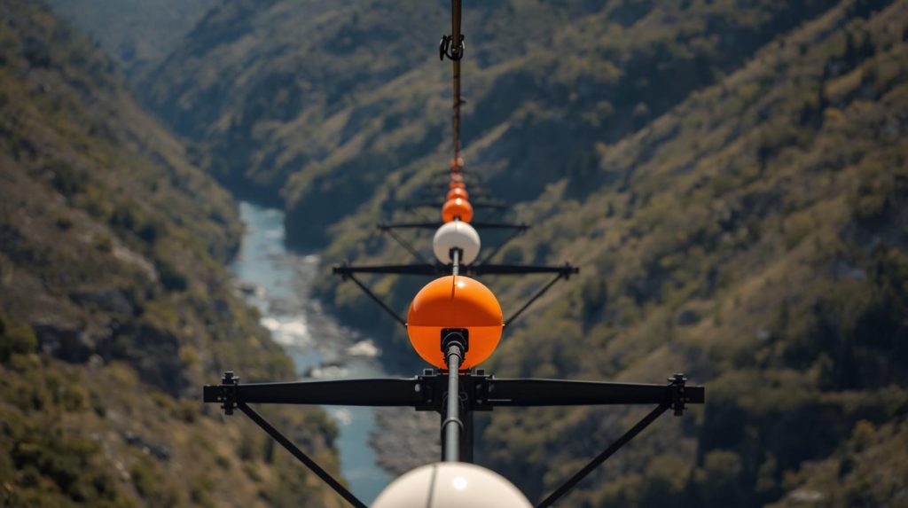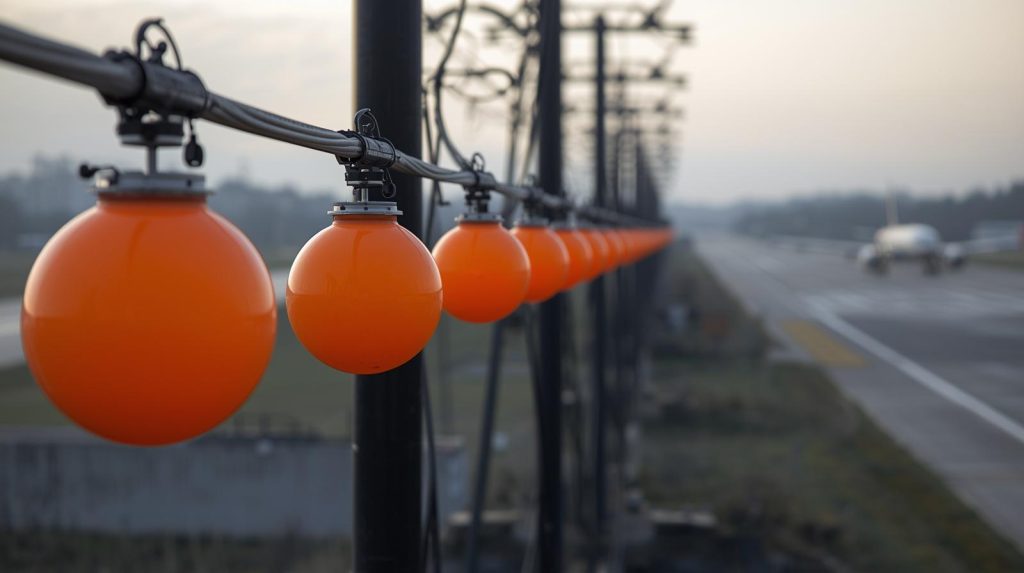 The balls are usually placed about 60 meters apart along the cables. In high-risk areas such as canyons, lakes, or nature reserves, they may be installed along the entire length of the line for maximum visibility. Near airports, the markers may appear closer together to warn pilots about obstacles during takeoff and landing.